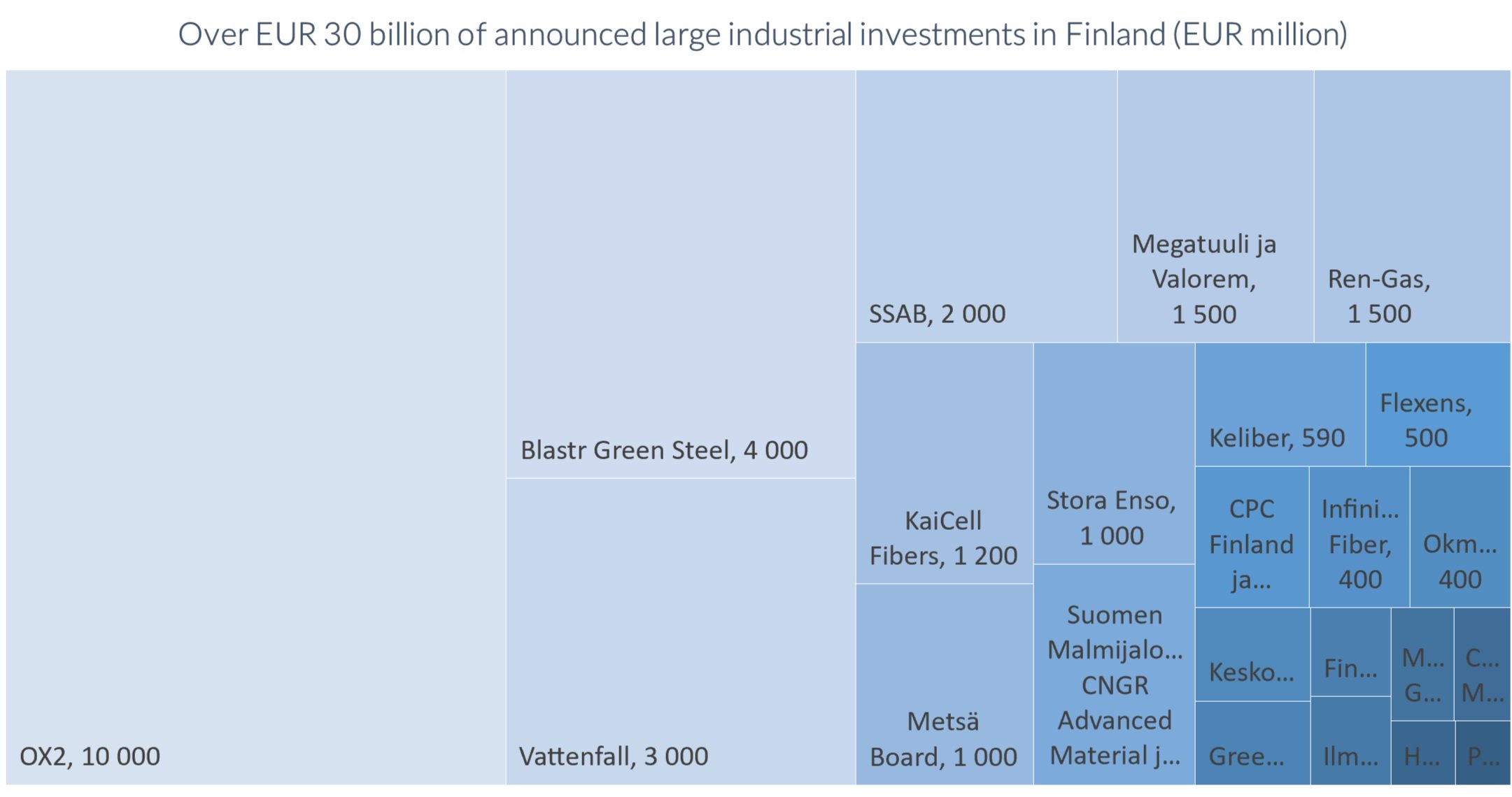 Massive investment wave is expected driven by industrial green transition investments. As of Spring 2023, there is some EUR 30 billion announced investment projects nationally, ranging from wind power to green hydrogen projects and from green steel to plant-based textile production.