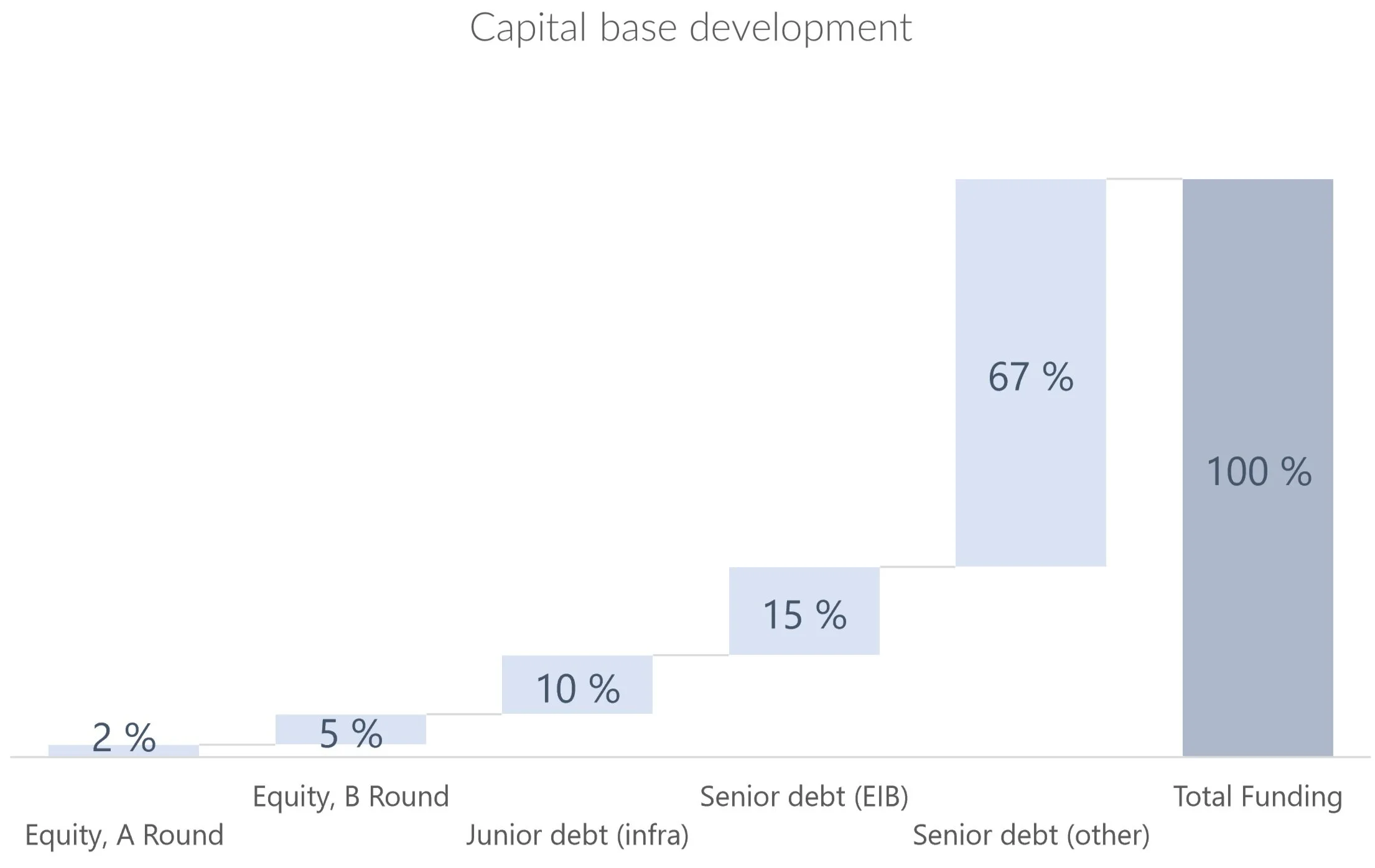 To cover this more in detail, we use an example funding structure of H2 Green Steel that is a Swedish green steel project located in Boden. This project is relatively large, being EUR 5 billion worth of investments but provides an example on how industrial green field start-ups can be financed.